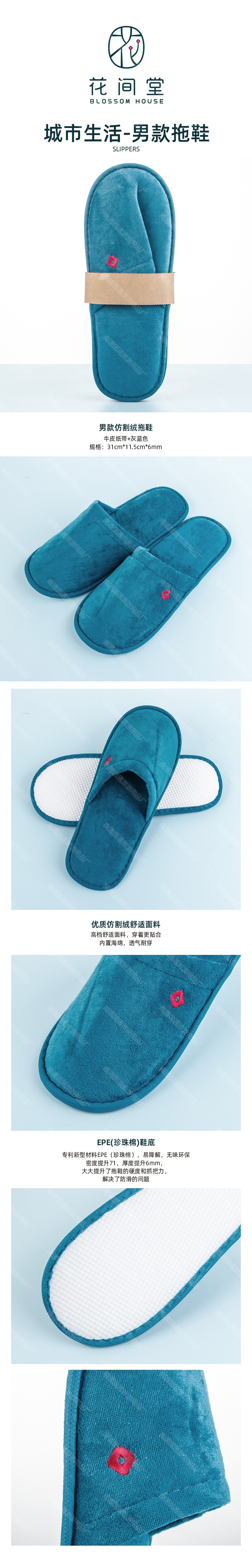 商品名称:一次性拖鞋 城市生活 男款 仿割绒复合海绵 logo刺绣 牛皮纸带 蓝绿色 31*11.5cm*6mm