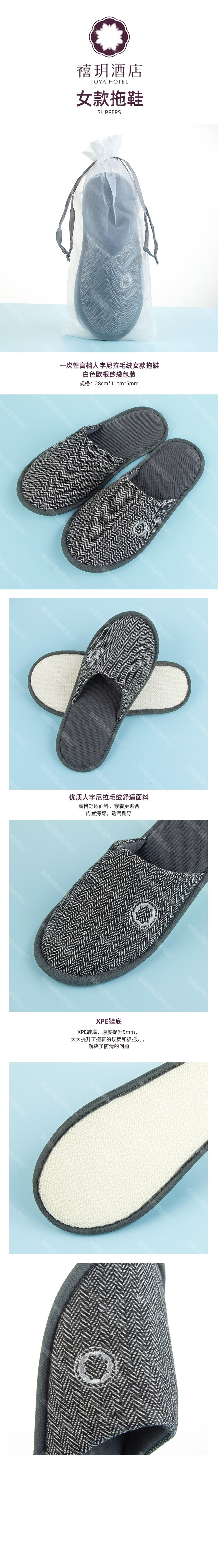 商品名称:一次性拖鞋 禧玥 女款 人字尼拉毛绒  logo刺绣 白色欧根纱袋 灰色 28*11cm*5mm